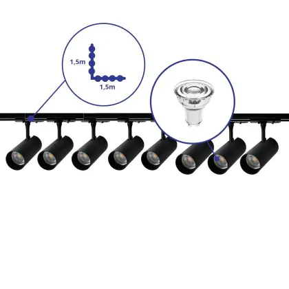 | Fabrikantnaam | Complete L shaped 1-Phase Track Set Black incl. 8x Spot fixture + GU10 2700K 3W Dim – 1,5 x 1,5 mete | |
