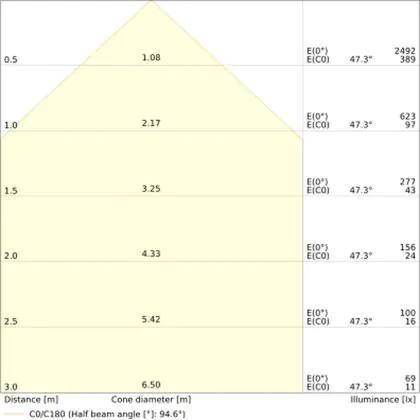 De gradenbundel geeft informatie over hoe breed het licht wordt uitgestraald. Dit zit tussen de 0 en 360 graden (D). Hoe kleiner de hoek, hoe specifieker de lichtbundel is. Over het algemeen is een smalle gradenbundel perfect voor sfeer- of accentverlichting, terwijl een brede gradenbundel ideaal is om grote oppervlaktes te verlichten.