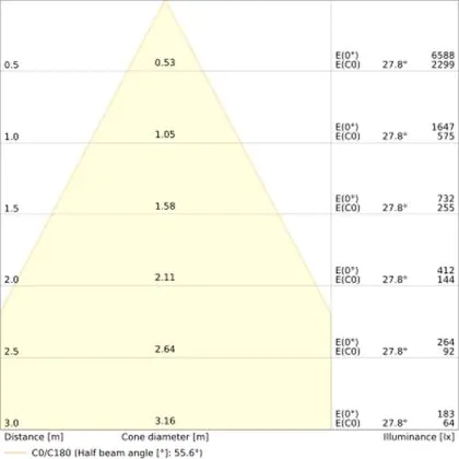 De gradenbundel geeft informatie over hoe breed het licht wordt uitgestraald. Dit zit tussen de 0 en 360 graden (D). Hoe kleiner de hoek, hoe specifieker de lichtbundel is. Over het algemeen is een smalle gradenbundel perfect voor sfeer- of accentverlichting, terwijl een brede gradenbundel ideaal is om grote oppervlaktes te verlichten.