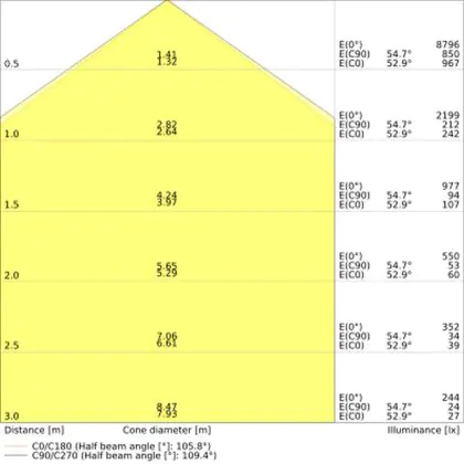 De lichtopbrengst (Lumen), geeft weer hoe krachtig het uitgestraalde licht is. Dit is belangrijk om te weten om de juiste sfeer te creëren. 0 tot 400 Lumen is bij uitstek geschikt voor accent- of sfeerverlichting. Een hoger aantal Lumen is, afhankelijk van de grootte van de ruimte, beter geschikt als ondersteunende- of basisverlichting. Heb je plafonds hoger dan 4 meter, dan is een lichtopbrengst van minimaal 8000lm aan te raden indien heldere verliching gewenst is (vb. in werkomgevingen).