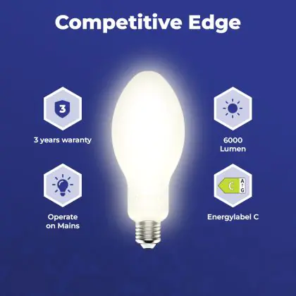 Met de aanschaf van deze LED HPL lamp met E40 fitting maak je een verantwoorde keuze. Deze LED variant is de zuinige vervanger van traditionele (HID) gasontladingslampen en is onder andere geschikt voor publieke ruimtes zoals bushokjes, parken, stations en parkeergarages. Ook kom je dit type LED gasontladingslamp tegen als verlichting voor straatlantaarns, magazijnen, fabrieken en winkels.
