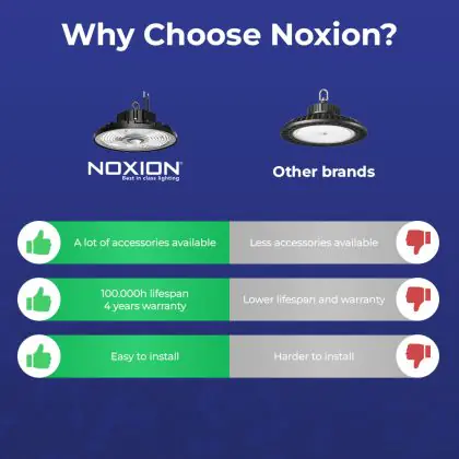 Noxion LED High-bays zijn gemaakt van de beste materialen en beschikken over LED componenten van zeer hoge kwaliteit. Deze Noxion LED High-bay is wat dat betreft geen uitzondering. En dat is onder andere te zien aan de 100000 branduren. Het voordeel van die lange levensduur is dat je na het plaatsen van dit sterke armatuur ruim 16 jaar (bij een verbruik van 60 uur per week) geen omkijken meer hebt naar deze LED verlichting. En dat scheelt weer in onderhoudskosten of het huren van een installateur en/of hoogwerker. Ook is aan het vermogen van 200 Watt goed te zien dat dit Noxion klokarmatuur vele malen zuiniger is dan conventionele high-bay verlichting. Oftewel: je bent verzekerd van een mooie energiebesparing, die kan oplopen tot 80%
